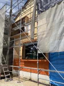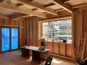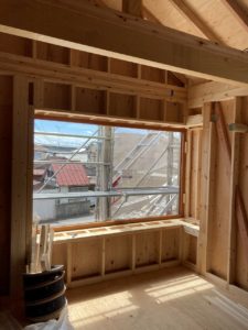 外装デザインの要となる木製窓が設置されました。
